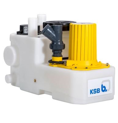 Bedrijfsklare, compacte opvoerinstallatie, volledig overstroombaar, gas- en waterdicht kunststof verzamelreservoir met buitenliggende terugslagklep, centrifugaalpomp met versnijdende waaier voor automatisch bedrijf door elektronische besturing.
